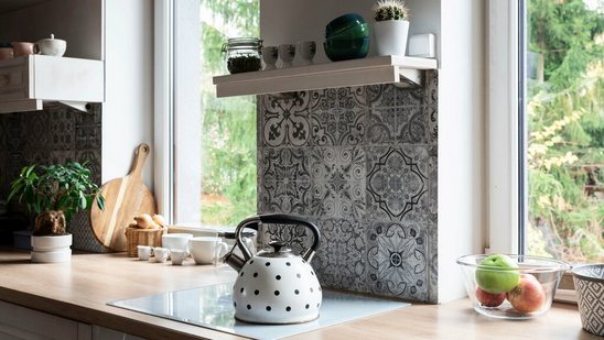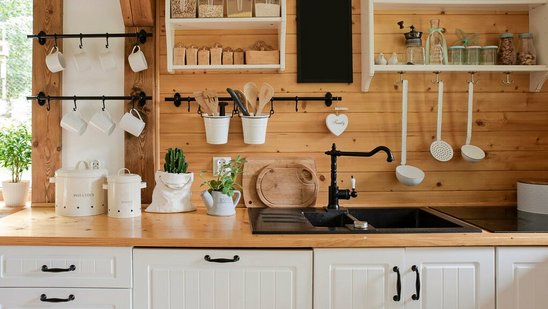 Holz ist für die Küche nur bedingt geeignet, da Feuchtigkeit und Verschmutzungen der Oberfläche auf lange Sicht zusetzen könnten. Insofern sind Fliesen (auch in Holzoptik) und hochwertige Steinböden eine sehr geschmackvolle Wahl, um den ländlich-charmanten Charakter dieses Einrichtungsstils aufzugreifen.