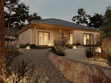 Der Bungalow 128 von Town & Country Haus verfügt nur über eine Etage. Er kann als reines Einfamilienhaus gebaut werden, doch ermöglicht der Grundriss auch ein Haus mit Einliegerwohnung im Erdgeschoss. Die Einliegerwohnung kann dann im Bereich neben dem Eingang angeordnet werden.